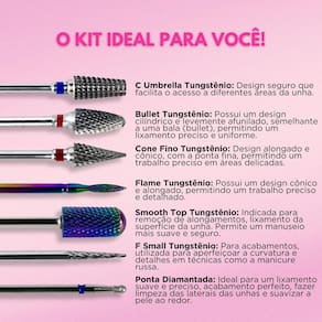 Contém: 01 - Broca Bullet Tungstênio 01 - Broca C Umbrella Tungstênio 01 - Broca Cone Fino Tungstênio 01 - Broca Flame Tungstênio 01 - Broca F Small Tungstênio 01 - Broca Ponta Diamantada 01 - Broca Smooth Top Tungstênio O kit ideal para manicures Perfeito para todos os atendimentos, composto por cortes de granulação média azul e fina vermelha . Composto por alguns modelos em tungstênio e outros diamantinos. Indicado para profissionais que buscam precisão e eficácia em todas as etapas do alongamento, desde a remoção até o acabamento final. Cada broca foi projetada para uma função específica, garantindo versatilidade e resultado impecável: Broca Bullet Tungstênio: Indicada para remoção eficiente de gel, acrílico e polygel, além de nivelamento e acabamento da unha. Broca C Umbrella Tungstênio: Utilizada para limpeza profunda da área da cutícula e remoção de excessos próximos à pele sem causar danos. Broca Cone Fino Tungstênio: Ideal para trabalhos delicados, como limpeza de sulcos laterais e refinamento da área da cutícula. Broca Flame Tungstênio: Indicada para levantamento e remoção precisa de cutículas, além de acabamento refinado. Broca F Small Tungstênio: Excelente para detalhes minuciosos, como limpeza de cutículas e polimento de áreas delicadas. Broca Ponta Diamantada: Perfeita para remoção suave de cutículas secas e polimento de superfícies com alta precisão. Broca Smooth Top Tungstênio: Utilizado para remoção de alongamentos e nivelamento da unha, proporcionando segurança e conforto ao redor da cutícula. Características Principais: - 7 Modelos de brocas; - Caixa que organiza até 10 brocas; - Acompanha caixa suporte organizador para as brocas; - Abrange todos os tipos de técnicas para as unhas; - Ideal para nail designer, manicure e podóloga; - Brocas com material de alta qualidade. Boas Compras ;