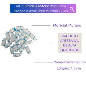 Kit 7 Firmas Azeitona 35x15mm Branca e Azul Cl Murano Guias Transforme seus projetos em obras de arte com o Kit 7 Firmas de Azeitona em Murano Branco e Azul Claro Com medidas de 3,5cm x 1,5cm, essas guias são ideais para adicionar um toque de sofisticação e precisão aos seus trabalhos. Não perca essa oportunidade de elevar o seu artesanato Composição: 100% Murano Formato de azeitona com furo passante no meio Dimensões da peça aproximada: 3,5 cm X 1,5 cm Produto 100% Artesanal, reprodução das cores podem variar de acordo com as configurações do seu monitor, lote de fabricação, o produto pode apresentar leve variação de cores e padrões. Imagens meramente ilustrativas Respostas das dúvidas mais frequentes na ordem: R1: Já realizamos milhares de entregas em todo o Brasil, somos especialistas no que fazemos. R2: Assim que seu pedido for despachado, esta plataforma envia para você o código de rastreamento. R3: Enviamos o produto 100% inspecionado e conferido em nosso checkout e são embalados em embalagem de papelão e plástico bolha. R4: O tempo de entrega irá depender totalmente do seu CEP, todos os nossos produtos saem de Capital. R5: Iremos despachar o seu produto o mais rápido possível, assim que for confirmado pela plataforma, enviamos em até 24h. R6: Nós queremos a sua satisfação, qualquer problema iremos te auxiliar em nossos canais de comunicações. Marca: Não Informado
