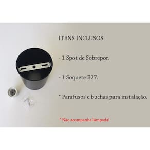- 1 Spot de Sobrepor. - 1 Soquete E27. Parafusos e buchas para instalação.