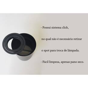 - Possuem foco Direcionável - Fácil Limpeza pano seco sem produtos abrasivos - Possui sistema click, no qual não é necessário retirar o spot para troca de lâmpada. - Uso externo / interno