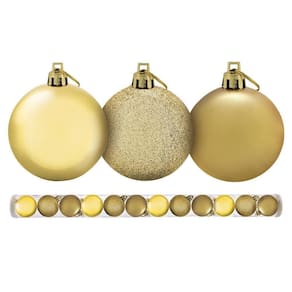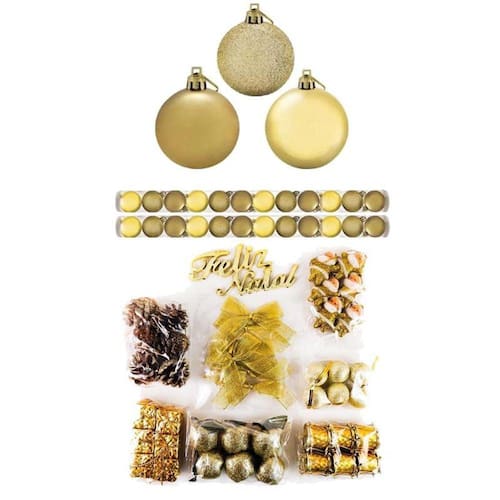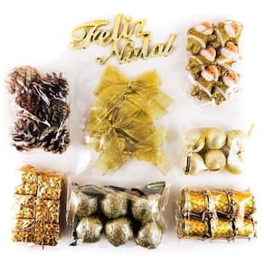 Composição: plástico, tecido espuma pinha papel Cor: dourado Quantidade: 43 enfeites Modelo: Pendentes para árvore de natal