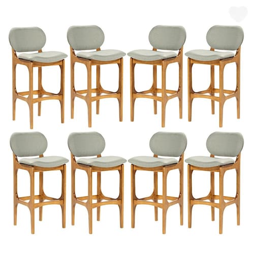 CARACTERÍSTICA TÉCNICAS: - Produzido em Madeira Maciça de Reflorestamento - Acabamento em Verniz na cor Castanho - Assento Estofado Preenchido com Espuma D-23 - Encosto Estofado Preenchido com Espuma D-18 - Tecido de Alta Qualidade em Linho na cor Verde L84 - Banqueta Entregue Montado - Kit Composto por OITO Banquetas Rafine