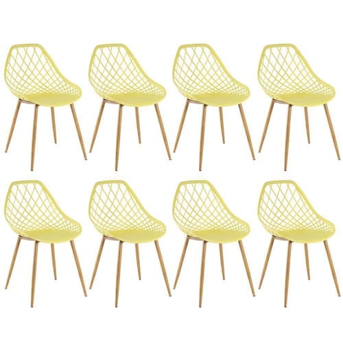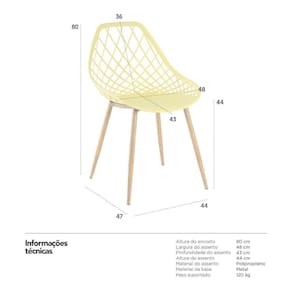 Material do assento: Polipropileno - Material dos pés: Metal - Altura do encosto: 80 cm - Altura do assento: 44 cm - Largura do assento: 48 cm - Profundidade do assento: 43 cm - Peso suportado: 120 kg.