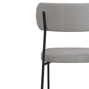 Encosto e assento estofados com espuma laminada, revestidos em Linho Cinza e Corano Preto.