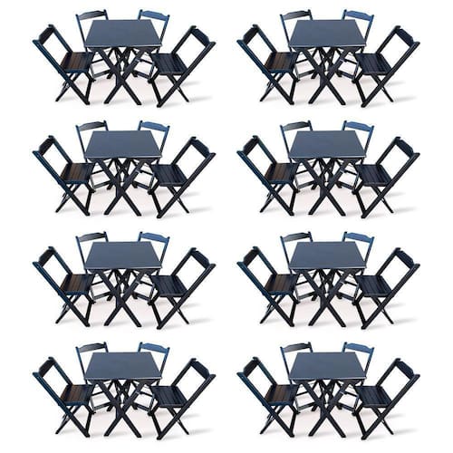 Kit 8 Conjunto Com Jogo De Mesa 70x70 Com 4 Cadeiras Dobráveis - Pretoé ideal para bares, restaurantes, estabelecimentos, áreas de lazer e tambem para sua casa. Em madeira maciça, tornando-os resistentes e duráveis. Seu design permite que esse conjunto seja encaixado em qualquer ambiente, trazendo um toque a mais para seu estabelecimento. Além de sua durabilidade, o que lhe trará conforto para servir seus clientes. Por ser dobrável torna-se mais fácil guardar, manusear e limpar o produto.Atenção: EVITE USAR PRODUTOS ABRASIVOS E QUÍMICOS PARA LIMPEZA DO PRODUTO, aconselha-se o uso de pano umedecido para melhor conservação mantenha o produto fora de chuva e sol constantes.*imagens meramente ilustrativas*Medidas mesa: Tampo 67,3 x 67,3 cm Altura 77cmDimensões Cadedeira: Altura da cadeira aberta 78cm Altura da cadeira fechada 89cm Altura até o assento 46cm Largura 41,5cm Largura vão do assento 37,5cm Profundidade 40cm Profundidade do assento 32cmKit 8 Conjunto com Jogo de Mesa 70x70 com 4 Cadeiras DobrÃveis - Preto