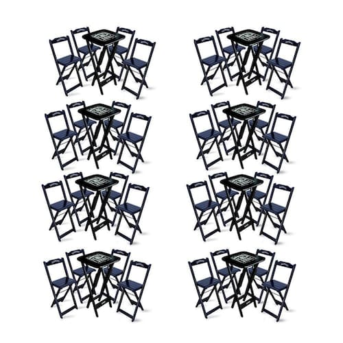Kit 8 Conjuntos De Mesa Bistrô Dobrável Jack Daniel S Com 4 Banquetas De Madeira PretaO Conjunto Jack Daniel?s é ideal para bares, restaurantes, estabelecimentos, áreas de lazer e também para sua casa. Em madeira maciça, tornando-os resistentes e duráveis. Seu design permite que esse conjunto seja encaixado em qualquer ambiente, trazendo um toque a mais para seu estabelecimento. Além de sua durabilidade, o que lhe trará conforto para servir seus clientes. Por ser dobrável torna-se mais fácil guardar, manusear e limpar o produto.CARACTERÍSTICAS BANQUETATipo: BanquetaModelo: Jack Daniel sCor: PretoBase: MadeiraDIMENSÕES DA BANQUETAAltura: 95cmLargura: 41,5cmComprimento: 43cmAltura do Assento até o chão: 61cmLargura do Assento: 37,5cmComprimento do Assento: 32cmAltura dobrada em pé: 105cmCARACTERÍSTICAS MESATipo: MesaModelo: Jack Daniel?SCor: PretoBase: MadeiraDIMENSÕES DA MESAAltura: 98cmLargura: 45cmComprimento: 54cmATENÇÃOIMAGENS MERAMENTE ILUSTRATIVAS REALIZADO EDIÇÃO, PODENDO HAVER UMA PEQUENA VARIAÇÃO DE COR DEPENDENDO DE CADA TELA OU MONITOR.Kit 8 Conjuntos de Mesa Bistrà DobrÃvel Jack Daniels com 4 Banquetas de Madeira Preta