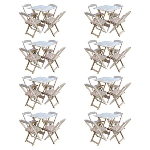 Kit 8 Conjuntos De Mesa Com 4 Cadeiras De Madeira Dobravel 70x70 Sem Pintura/Cruaé ideal para bares, restaurantes, estabelecimentos, áreas de lazer e tambem para sua casa. Feito em madeira maciça, tornando resistentes e duráveis. Seu design permite que seja encaixado em qualquer ambiente, trazendo um toque a mais para seu estabelecimento. Além de sua durabilidade, o que lhe trará conforto para servir seus clientes. Por ser dobrável torna-se mais fácil guardar, manusear e limpar o produto.Atenção: EVITE USAR PRODUTOS ABRASIVOS E QUíMICOS PARA LIMPEZA DO PRODUTO, aconselha-se o uso de pano umedecido para melhor conservação; mantenha o produto fora de chuva e sol constantesMESA Cor: Sem Pintura/Crua Modelo: Dobravel Dimensões: Altura 76cm | Largura 70cm | Profundidade 70cmCADEIRA Cor: Sem Pintura/Crua Modelo: Dobravel Dimensões: Altura 80cm | Largura 45cm | Profundidade 42cmKit 8 Conjuntos de Mesa com 4 Cadeiras de Madeira Dobravel 70x70 sem Pintura/crua Marca: Preguiçosa