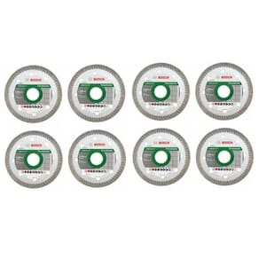 Kit 8 Disco Diamantado 4.3/8 Turbo Pro Para Porcelanato Bosch Disco Diamantado Turbo Porcelanato Ultra Fino 105mm BoschCom design turbo fino, permite acabamento fino e preciso com boa velocidade de corte com efeito de resfriamento evitando aquecimento e danos no disco.Performance adequada para os principais revestimentos duro do mercado, como porcelanatos, placas de mármore e granito, permitindo excelente vida útil também em aplicações secas.O corte Fino que proporciona menor vibração e mais estabilidade do que a concorrência devido à espessura do corpo do disco 1,2 mm que garante menores deformações ao esquentar. Facilidade de corte Menor risco de quebra do disco Acabamento com bordas limpas e sem rebarbasAplicação:Porcelanatos, Azulejos cerâmicos, cerâmicas e ladrilhos, marmore e granitos.