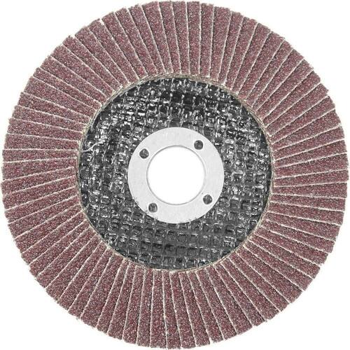 Disco de desbaste tipo flap sextavado e feito de lixas retangulares na base de tecido que são situadas como um leque com fibra de vidro como material de base. utilizado em trabalhos de polimento de metal, madeira e outros materiais.