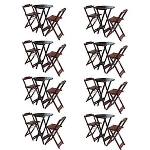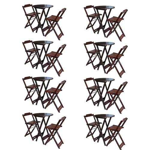 Kit 8 Jogos De Mesa Bistrô De Madeira Com 2 Cadeiras Dobravel Ideal Para Bar E Restaurante Imbuia é ideal para bares, restaurantes, estabelecimentos, áreas de lazer e tambem para sua casa. Feito em madeira maciça, tornando resistentes e duráveis. Seu design permite que seja encaixado em qualquer ambiente, trazendo um toque a mais para seu estabelecimento. Além de sua durabilidade, o que lhe trará conforto para servir seus clientes. Por ser dobrável torna-se mais fácil guardar, manusear e limpar o produto. Atenção: EVITE USAR PRODUTOS ABRASIVOS E QUíMICOS PARA LIMPEZA DO PRODUTO, aconselha-se o uso de pano umedecido para melhor conservação; mantenha o produto fora de chuva e sol constantes. OBS: MDF ULTRA MESA Cor: Imbuia Modelo: Bistrô Dobravel Dimensões: Altura 99cm | Largura 55cm | Profundidade 55cm CADEIRA Cor: Imbuia Modelo: Bistrô Dobravel Dimensões: Altura 100cm | Largura 38cm | Profundidade 37cm