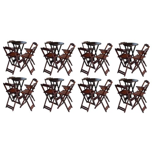 Kit 8 Jogos De Mesa Bistrô De Madeira Com 4 Cadeiras Dobravel Ideal Para Bar E Restaurante Imbuia é ideal para bares, restaurantes, estabelecimentos, áreas de lazer e tambem para sua casa. Feito em madeira maciça, tornando resistentes e duráveis. Seu design permite que seja encaixado em qualquer ambiente, trazendo um toque a mais para seu estabelecimento. Além de sua durabilidade, o que lhe trará conforto para servir seus clientes. Por ser dobrável torna-se mais fácil guardar, manusear e limpar o produto. Atenção: EVITE USAR PRODUTOS ABRASIVOS E QUíMICOS PARA LIMPEZA DO PRODUTO, aconselha-se o uso de pano umedecido para melhor conservação; mantenha o produto fora de chuva e sol constantes. OBS: MDF ULTRA MESA Cor: Imbuia Modelo: Bistrô Dobravel Dimensões: Altura 99cm | Largura 55cm | Profundidade 55cm CADEIRA Cor: Imbuia Modelo: Bistrô Dobravel Dimensões: Altura 100cm | Largura 38cm | Profundidade 37cm
