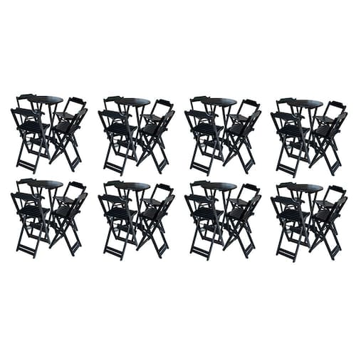 Kit 8 Jogos De Mesa Bistrô De Madeira Com 4 Cadeiras Dobravel Ideal Para Bar E Restaurante Preto é ideal para bares, restaurantes, estabelecimentos, áreas de lazer e tambem para sua casa. Feito em madeira maciça, tornando resistentes e duráveis. Seu design permite que seja encaixado em qualquer ambiente, trazendo um toque a mais para seu estabelecimento. Além de sua durabilidade, o que lhe trará conforto para servir seus clientes. Por ser dobrável torna-se mais fácil guardar, manusear e limpar o produto. Atenção: EVITE USAR PRODUTOS ABRASIVOS E QUíMICOS PARA LIMPEZA DO PRODUTO, aconselha-se o uso de pano umedecido para melhor conservação; mantenha o produto fora de chuva e sol constantes. OBS: MDF ULTRA MESA Cor: Preto Modelo: Bistrô Dobravel Dimensões: Altura 99cm | Largura 55cm | Profundidade 55cm CADEIRA Cor: Preto Modelo: Bistrô Dobravel Dimensões: Altura 100cm | Largura 38cm | Profundidade 37cm