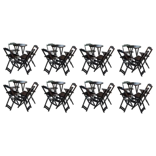 Kit 8 Jogos De Mesa Bistrô De Madeira Com 4 Cadeiras Dobravel Ideal Para Bar E Restaurante Tabaco é ideal para bares, restaurantes, estabelecimentos, áreas de lazer e tambem para sua casa. Feito em madeira maciça, tornando resistentes e duráveis. Seu design permite que seja encaixado em qualquer ambiente, trazendo um toque a mais para seu estabelecimento. Além de sua durabilidade, o que lhe trará conforto para servir seus clientes. Por ser dobrável torna-se mais fácil guardar, manusear e limpar o produto. Atenção: EVITE USAR PRODUTOS ABRASIVOS E QUíMICOS PARA LIMPEZA DO PRODUTO, aconselha-se o uso de pano umedecido para melhor conservação; mantenha o produto fora de chuva e sol constantes. OBS: MDF ULTRA MESA Cor: Tabaco Modelo: Bistrô Dobravel Dimensões: Altura 99cm | Largura 55cm | Profundidade 55cm CADEIRA Cor: Tabaco Modelo: Bistrô Dobravel Dimensões: Altura 100cm | Largura 38cm | Profundidade 37cm