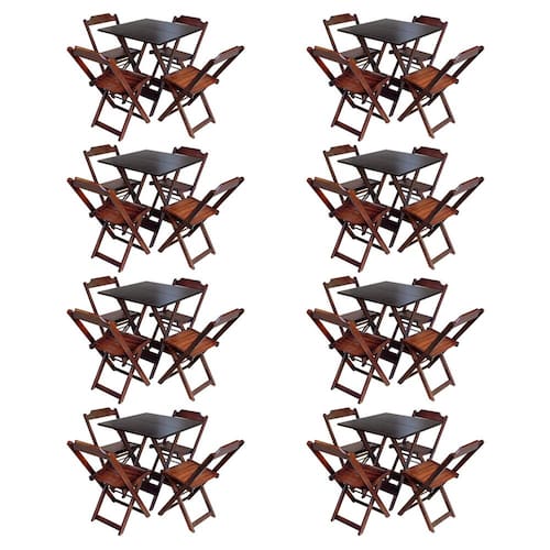Kit 8 Jogos De Mesa Com 4 Cadeiras De Madeira Dobravel 60x60 Ideal Para Bar E Restaurante - Imbuia É ideal para bares, restaurantes, estabelecimentos, áreas de lazer e tambem para sua casa. Feito em madeira maciça, tornando resistentes e duráveis. Seu design permite que seja encaixado em qualquer ambiente, trazendo um toque a mais para seu estabelecimento. Além de sua durabilidade, o que lhe trará conforto para servir seus clientes. Por ser dobrável torna-se mais fácil guardar, manusear e limpar o produto.