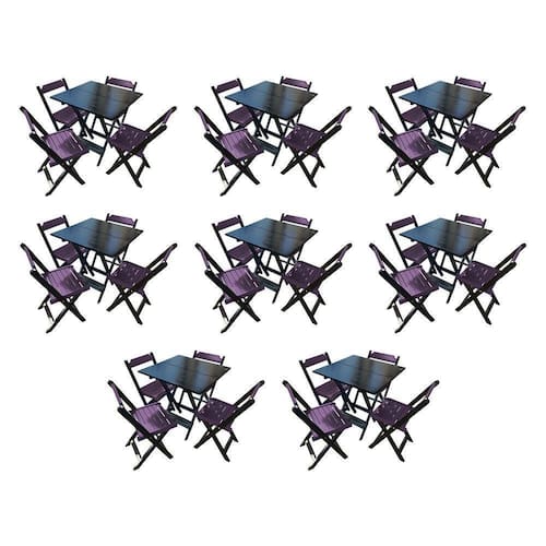Kit 8 Mesas De Madeira Dobrável Preto 70x70 Com 4 Cadeiras Dobráveis RoxoÉ ideal para bares, restaurantes, estabelecimentos, áreas de lazer e também para sua casa. Feito em madeira maciça, seu design permite que seja encaixado em qualquer ambiente, trazendo um toque a mais para seu estabelecimento. Por ser dobrável torna-se mais fácil de guardar, manusear e limpar o produto.CaracterísticasTipo: ConjuntoModelo: dobrávelCor do tampo: Preto Base: Madeira maciçaCor do assento: RoxoDIMENSÕES DO PRODUTOMesa:Altura: 77cmLargura: 70cmComprimento: 70cmQuantidade de mesas: 8Cadeira:Altura: 77cmLargura: 43cmComprimento: 42cmQuantidade de cadeiras: 32 ATENÇÃOEVITE USAR PRODUTOS ABRASIVOS E QUÍMICOS PARA LIMPEZA DO PRODUTO, ACONSELHA-SE O USO DE PANO UMEDECIDO PARA MELHOR CONSERVAÇÃO.AS IMAGENS SÃO MERAMENTE ILUSTRATIVAS E PODEM SOFRER VARIAÇÕES DE COR E PEQUENOS DETALHES DE ACORDO COM O SEU MONITOR, ILUMINAÇÃO DO AMBIENTE E ATÉ MESMO A SUA PERCEPÇÃO VISUAL. Kit 8 Mesas de Madeira DobrÃvel Preto 70x70 com 4 Cadeiras DobrÃveis Roxo