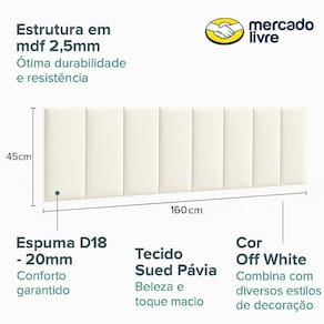 Nome do modelo: Cabeceira Maya;Quantidade de módulos: 8 peças adesivas;Dimensões de cada módulo: 45 cm (A) x 20 cm (L);Medida total montada: 160 cm x 45 cm;Cor: Off White;Revestimento: Tecido Sued Pávia;Espuma: D18 com 2 cm de espessura;Estrutura: MDF 2,5 mm;Fixação: Fita dupla face (inclusa);Marca: Bela Manu Decor.Ideal para transformar seu quarto com estilo, sem complicação.
