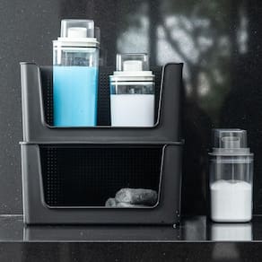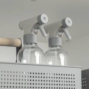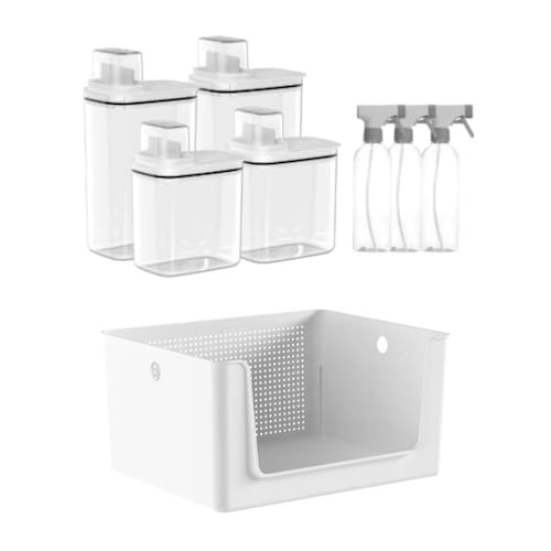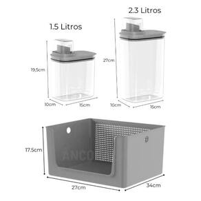Organize e padronize sua rotina! 2 dispensers 1,5L + 2 dispensers 2,3L (tampa medidora, vedação e caimento interno) + cesto com abertura frontal + 3 borrifadores 500 ml (trava on/off) + 2 cartelas de adesivos para identificar soluções e categorias.