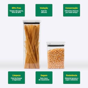 Ideal para armazenar Grãos, Cereais, Massas, Farinhas, Café em Grão, Chás, Ervas, Biscoitos, Snacks, Salgadinhos e muito mais, ele preserva o frescor dos alimentos por mais tempo. Sua tampa de plástico resistente com borda em silicone proporciona um fechamento hermético, a solução perfeita para manter seus alimentos frescos e protegidos por mais tempo. Com vedação hermética, impede a entrada de ar e umidade, preservando o sabor e a textura dos alimentos.