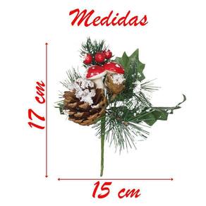 Possui 8 Ramos, com 2 Cogumelo, 2 Pinhas, Cada peça. Altura: 17 cm Cor: Verde, Vermelho, Branco. Material: Plástico, Isopor