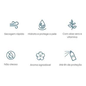 - hidrata e protege a pele - não oleoso - perfume agradável - secagem rápida - dermatologicamente testado - até 6 horas de proteção - com aloe vera e vitamina e