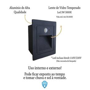Kit 9 Balizador Parede Led Sensor Presença Embutir Preto Lup72 O lup72 é ideal para iluminar caminhos externos ou internos. Embutido na sua escada, muro ou parede, se torna uma peça harmoniosa por conta da sua cor branco texturizado e o seu design clear. Além disso, com sua tecnologia de proporcionar luz através da identificação de movimentos próximo de si por meio do sensor de presença e infravermelho, torna-se uma peça essencial, pois seus caminhos ou passagens terão uma orientação de luz automatizada já ao anoitecer, sem precisar se preocupar em ligar para ter a iluminação e muito menos se atentar em desligar, visto que após 30 segundos sem nenhuma presença próximo do balizador dentro dos 5 metros de alcance de leitura, ele automaticamente desliga.