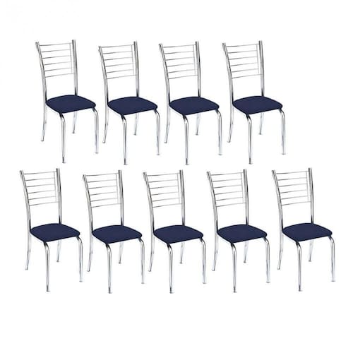 Kit 9 Cadeiras De Jantar Lara Cromada Para Cozinha Assento Sintético Azul Marinho - Aurora Line Cadeira Para Cozinha Lara - Aurora Line A Cadeira Lara é a opção ideal para sua casa. Se você está procurando por uma cadeira de jantar que seja perfeita para a sua cozinha, com estilo industrial, resistente e confortável, a Cadeira Lara é a escolha certa. Seja para casas, apartamentos ou áreas gourmet, essa cadeira vai se encaixar perfeitamente no seu espaço. Com um design moderno e elegante, a Cadeira Lara combina perfeitamente com diferentes estilos de decoração. Se você gosta de um ambiente mais industrial, essa cadeira vai trazer um toque de personalidade para a sua casa. Além disso, ela também é versátil o suficiente para se adaptar a outros estilos, como o contemporâneo ou o rústico.Além do design, a Cadeira Lara também se destaca pela sua resistência. Feita com materiais de alta qualidade, ela é capaz de suportar o uso diário sem perder a sua durabilidade. Se você tem uma família grande ou adora receber amigos para jantar, essa cadeira é perfeita para você. Ela vai garantir conforto e segurança para todos.Outro ponto importante da Cadeira Lara é o seu conforto. Com um assento acolchoado e encosto ergonômico, essa cadeira proporciona uma experiência agradável durante as refeições. Você vai poder desfrutar de momentos de descontração e prazer à mesa, seja para um jantar em família ou um encontro com amigos.