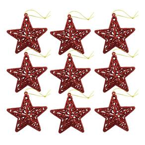Kit 9 Estrelas Natal Arabesco Vazada Glitter Vermelho 9cm