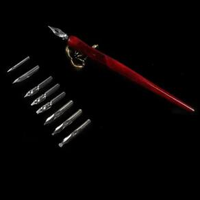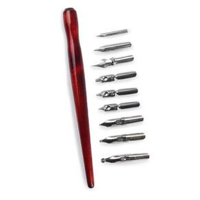 Composto por uma caneta tinteiro de madeira e 9 pontas diferentes para variados estilos de traço e espessura.