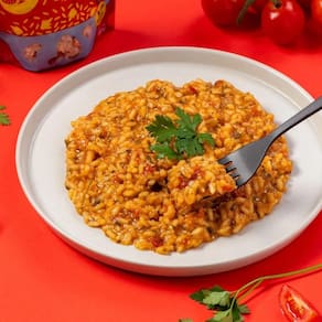 Arroz arbório com pedacinhos de tomates selecionados, proporcionando um sabor fresco e autêntico.