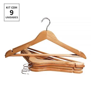 ------------------------------------------------------------------------------------- O seu guarda-roupas nunca mais ficará bagunçado e a suas roupas amassadas, com esse conjunto de cabides fabricados em madeira de extrema qualidade e com gancho feito em metal, suas roupas estarão sustentadas com MAIS charme e MAIS elegância. --------------------------- Características: ---------------------------