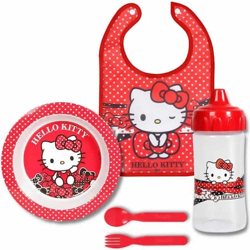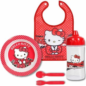 - O Kit Hora da Papinha Hello Kitty torna o momento da alimentação mais divertido com os personagens favoritos do seu bebê! Contém produtos que estimulam a autonomia.- Talheres no tamanho ideal para o desenvolvimento da habilidade, prato bowl decorado com capacidade para ir ao microondas, copo de treinamento com redutor de pingos que evita possíveis sujeiras e babador com porta migalhas.- O kit foi desenvolvido com materiais de qualidade, resistentes, totalmente atóxicos e sem cheiro. Desta forma, seu dia a dia se torna mais prático e você aproveita melhor os momentos com a sua família.