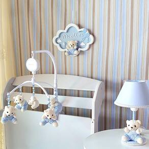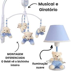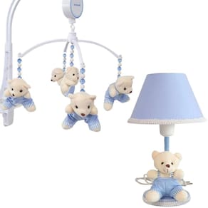 Móbile para berço menino o móbile para berço musical é um item na decoração muito importante, bastante gracioso, meigo e lúdico O movimento das peças vai entreter o bebê dentro do bercinho, ideal para embalar o sono do neném O mobile berço musical é ótimo para estimular audição e visão do bebê. não é a toa que eles são pendurados acima do seu amor. Especialistas dizem que os móbiles ainda estimulam o senso de direção e lateralidade, fazendo com que a criança acompanhe o objeto de um lado para o outro. Pensando em todos os benefícios para o bebê, nós da erich baby fazemos a montagem do móbile diferenciada, onde a montagem é feita com os ursinhos olhando para baixo, para o bebê visualizar o ursinho por completo e estimular mais. conteúdo: -mobile musical e giratório com 5 ursinhos - acompanha 1 suporte para fixar no berço e caixa de música à corda sem necessidade de uso de pilha. Contém a trava de interrupção, a canção dura em média de 2 a 3 minutos. Cores e estampas podem ser alteradas segundo nosso . Medidas: - 4 ursinhos de pelúcia de 10 cm - 1 ursinho de pelúcia de 6 cm - suporte móbile: Altura: 55.00 cm Largura: 35.00 cm Comprimento: 45.00 cm Peso: 360 gramas Modo de montar: O suporte se encaixa em qualquer berço desmontável, chiqueirinho e berço americano. Basta encaixar as peças e rosquear no berço que o móbile estará preso. Limpeza: Basta limpar com pano úmido. Abajur bebê urso lindo abajur em tecido com um ursinho na base para o quarto do bebê, ideal para deixar o ambiente com funcionalidade e muito mais charme e beleza. O abajur infantil vai deixar o quarto pronto para a chegada do bebê em casa Com uma variedade de tecido à escolha tem toda a delicadeza de um enxoval confeccionado especialmente para quem deseja o abajur personalizado, combinando com qualquer tipo de decoração. O abajur, ilumina o quartinho na medida certa e facilita as mamadas e trocas noturnas. Onde usar: Poderá ser colocado na cômoda ou mesa. Contém 1 peça: 1 abajur - com iluminação suave, ajuda as mamães a cuidar do bebê à noite. Composição: Abajur com cúpula de polipropileno plástico , revestido por tecido 100% algodão. Base de madeira revestida de tecido Metragem: Abajur 28cm altura Cúpula 10cm x 18cm Bivolt: 110v ou 220v Lâmpada: usar de no máximo 40w não inclusa Tamanho fio 70 cm com liga / desliga Conteúdo da embalagem: 1 abajur com urso na base Limpeza: Basta limpar com espanador ou pano seco. Perguntas frequentes: Para esclarecer as principais dúvidas de nossos clientes, separados a seguir as principais perguntas sobre nosso produto, serviços, qualidade, envio e muito mais. A imagem que vejo no site, representa exatamente o que vou receber Embora respeitemos no site todas as proporções, definição de cores, brilho e contraste, variam de acordo com o modelo e calibragem dos monitores e tela de celulares. Como é um produto artesanal pode ocorrer uma pequena variação na tonalidade do tecido. Como faço para limpar meu abajur Somente com espanador ou pano seco Vocês têm loja física Não, nossa loja é somente virtual. Onde é a loja Somos de - capital, somente loja online. Quais são as formas de pagamento