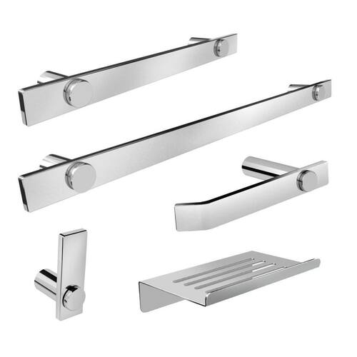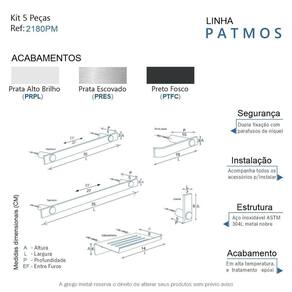O kit acessórios de banheiro da linha Patmos possui um design atemporal e discreto, são peças de requinte que se destaca com glamour no seu banheiro. Além de decorar, organiza com funcionalidade o banheiro. Criado em metais nobres com uma qualidade que abrange áreas litorâneas e possui a de acabamento alto resistente. Agora é só você adquirir estes lindos acessórios e fazer o seu projeto se tornar realidade com um banheiro prático para toda a sua família. Características Fabricado em metal aço inox. Disponível no Prata Alto Brilho, Escovado e Preto Fosco. Pode ser instalado em parede, azulejo e porcelanato. Benefícios Fixação prática e segura com parafusos e buchas inclusos. O produto não possui nenhum detalhe em plástico ABS . Fácil higienização, ideal para locais que exigem limpeza constante. Aproveitamento inteligente do espaço, ideal para ambientes compactos. Resistente à corrosão e luz solar. Itens ENVIADOS: 1 cabide, 1 porta papel higiênico, 1 saboneteira, 1 toalheiro 35cm, 1 toalheiro 55cm, kit de parafusos e manual instrução instalação. Instalação INTELIGENTE Ao 1º furo, use uma broca medida menor, após use a medida correta e finalize, vai ajudar na precisão da fixação da bucha principalmente em azulejos e porcelanato. Marca: Não Informado