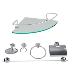 Contém na caixa: 01 porta shampoo vidro temperado canto 01 un porta toalha reto 01 un porta toalha redondo 01 un saboneteira aço inox 01 un papeleira com tampa 01 un cabide duplo