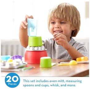 Este conjunto de 20 peças é perfeito para crianças que gostam de brincar de cozinhar. Feitas de materiais premium, como aço inoxidável e madeira maciça, as ferramentas de cozimento são do tamanho certo para mãos pequenas e cozinhas lúdicas. O conjunto inclui luva de forno, colheres e xícaras medidoras, batedor, espátula, tigela, forma de muffin, cortadores de biscoitos, rolo, colher e forma de bolo. Todas as peças são próprias para máquina de lavar louça, feitas de aço inoxidável de alta qualidade, utensílios de madeira maciça e plástico sem BPA. O conjunto Melissa Doug Lets Play House Baking Play incentiva brincadeiras independentes e imaginativas e o desenvolvimento de habilidades motoras. É um ótimo presente para crianças de 3 a 8 anos. A Melissa Doug tem mais de 30 anos de experiência em criar produtos lindamente projetados que estimulam a imaginação e a criatividade das crianças.