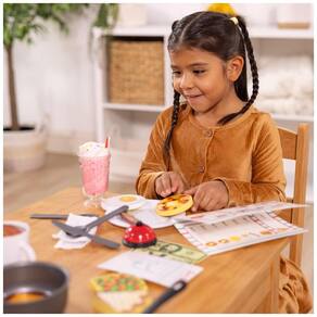 Este conjunto de jogos de restaurante de 41 peças é tudo o que as crianças precisam para servir clássicos deliciosos de lanchonetes. Inclui um menu reutilizável, uma frigideira de plástico durável, uma espátula e talheres completos. Há sete pedaços de comida de madeira com diferentes opções de comida em ambos os lados, além de milk shakes de dupla face e inserções de bebidas quentes. O avental e a campainha permitem que os garçons e chefs sirvam as refeições, enquanto os clientes podem pagar suas contas usando o marcador de secagem no cheque do convidado com o dinheiro fictício incluído. O conjunto também inclui um guardanapo de tecido, um avental com bolsos, um cardápio e dinheiro fictício. Este conjunto inspira crianças a partir de 3 anos a desfrutar de horas de brincadeiras práticas e sem tela. É um ótimo presente para crianças a partir de 3 anos. O conjunto vem com 41 peças de cozinha e culinária realistas e de alta qualidade, incluindo uma espátula, uma frigideira, uma cafeteira, um prato, um garfo, uma faca, uma colher, um copo de milk shake, um canudo e uma caneca.