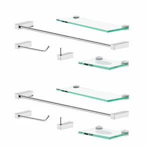 - CONTEÚDO DA EMBALAGEM: 2 Cabides, 2 Papeleiras, 2 Saboneteiras, 2 Portas Toalha 50cm, 2 Portas Shampoo Reto 30cm, 1 Kit de parafusos e 1 Manual (Instrução de Instalação)