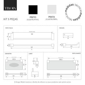 - MEDIDA TÉCNICA CM: (Cabide A5xL3xP6)- (Papeleira A3xL15xP7)-(Porta Toalha A3xL50xP6)-(Saboneteira A2xL14xP10)-(Porta Shampoo Reto A2xL30xP10).