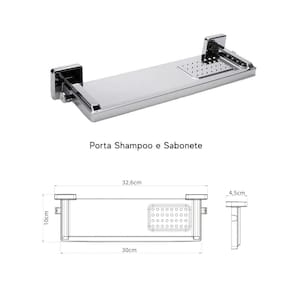 Informações técnicas: Cor: Cromado Acabamento: Brilhante Composição: Plástico PP e PSAI Fixação: - Saboneteira, papeleira e gancho: adesiva - Porta-shampoo: encaixe Fixação adesiva ideal para superfícies de: Vidro, porcelanatos, granitos, pisos cerâmicos e mármores Dimensões C x A x L : - Porta Shampoo: 30cm x 4,5cm x 10cm - Saboneteira: 14cm x 9,7cm x 3,9cm - Porta Papel Higiênico: 13,7cm x 3,9cm x 8,8cm - Gancho: 3,8cm x 4,5cm x 3,6cm