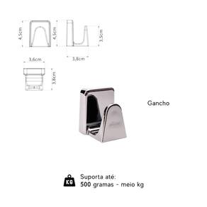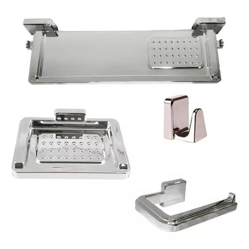 Informações técnicas: Cor: Cromado Acabamento: Brilhante Composição: Plástico PP e PSAI Fixação: - Saboneteira, papeleira e gancho: adesiva - Porta-shampoo: encaixe Fixação adesiva ideal para superfícies de: Vidro, porcelanatos, granitos, pisos cerâmicos e mármores Dimensões C x A x L : - Porta Shampoo: 30cm x 4,5cm x 10cm - Saboneteira: 14cm x 9,7cm x 3,9cm - Porta Papel Higiênico: 13,7cm x 3,9cm x 8,8cm - Gancho: 3,8cm x 4,5cm x 3,6cm