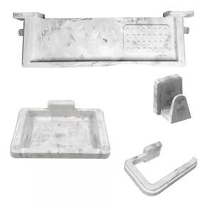 Informações técnicas: Cor: Branco Mármore Acabamento: Brilhante Composição: Plástico PP e PSAI Fixação: - Saboneteira, papeleira e gancho: adesiva - Porta-shampoo: encaixe Fixação adesiva ideal para superfícies de: Vidro, porcelanatos, granitos, pisos cerâmicos e mármores Dimensões C x A x L : - Porta Shampoo: 30cm x 4,5cm x 10cm - Saboneteira: 14cm x 9,7cm x 3,9cm - Porta Papel Higiênico: 13,7cm x 3,9cm x 8,8cm - Gancho: 3,8cm x 4,5cm x 3,6cm