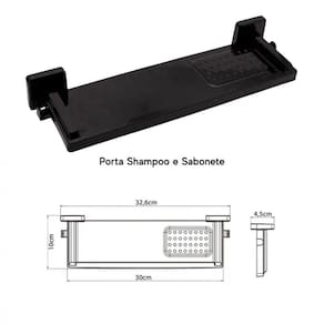 Informações técnicas: Cor: Preto Acabamento: Brilhante Composição: Plástico PP e PSAI Fixação: - Saboneteira, papeleira e gancho: adesiva - Porta-shampoo: encaixe Fixação adesiva ideal para superfícies de: Vidro, porcelanatos, granitos, pisos cerâmicos e mármores Dimensões C x A x L : - Porta Shampoo: 30cm x 4,5cm x 10cm - Saboneteira: 14cm x 9,7cm x 3,9cm - Porta Papel Higiênico: 13,7cm x 3,9cm x 8,8cm - Gancho: 3,8cm x 4,5cm x 3,6cm