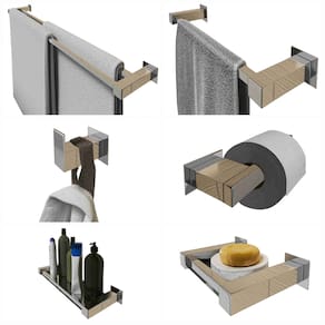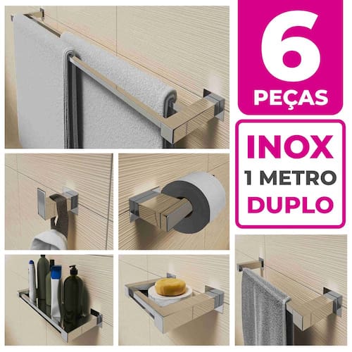 Contendo: 1 Cabide Linha Quadrada 1 Papeleira Linha Quadrada 1 Saboneteira Linha Quadrada 1 Porta Shampoo 30cm Linha Quadrada 1 Toalheiro De Rosto 30cm Linha Quadrada 1 Toalheiro Duplo 1M Linha Quadrada
