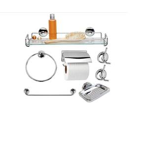 • 1 Pç Porta-toalha Reto 60cm 1 Pç Porta-toalha argola 1 Pç Saboneteira de parede 1 Pç Prateleira 40x10cm 1 Pç Porta-papel com tampa 2 Pç Gancho