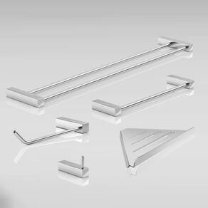 ITENS ENVIADOS: 1 cabide, 1 porta papel higiênico, 1 toalheiro rosto 30cm, 1 toalheiro duplo 60cm, 1 prateleira suporte canto 30cm, kit de parafusos e manual instrução instalação.