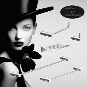 ITENS ENVIADOS: 1 cabide, 1 porta papel higiênico, 1 toalheiro rosto 30cm, 1 toalheiro banho 50cm, 1 saboneteira, kit de parafusos e manual instrução instalação.