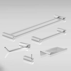 ITENS ENVIADOS: 1 cabide, 1 porta papel higiênico, 1 toalheiro rosto 30cm, 1 toalheiro duplo 60cm, 1 saboneteira, kit de parafusos e manual instrução instalação.