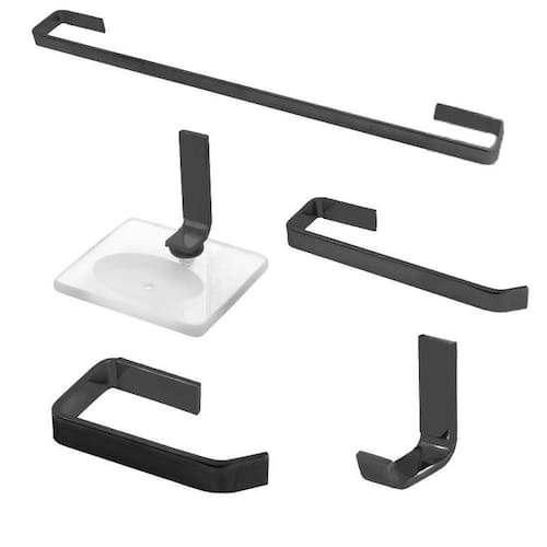 Kit Acessórios Para Banheiro Athena Em Vergalhão Preto Material: Aço inox Cor: Preto : 5 anos Fixação: Parafusos e buchas Composição: 01 papeleira 01 saboneteira 01 porta toalha banho 45 cm 01 porta toalha rosto 01 cabide Buchas e parafusos Fixação dupla Marca: Não Informado Ean: 7892236012963