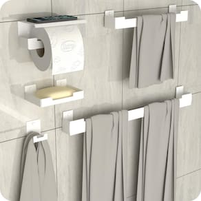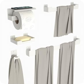 ITENS INCLUSOS 1 Porta Toalha de Banho 1 Porta Toalha de Rosto 1 Porta Papel Higiênico 1 Gancho 1 Saboneteira Parafusos e buchas para instalação