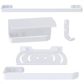 ITENS INCLUSOS 1 Porta Toalha de Banho 1 Porta Toalha de Rosto 1 Porta Papel Higiênico 1 Gancho 1 Saboneteira Parafusos e buchas para instalação Tampas para esconder os parafusos